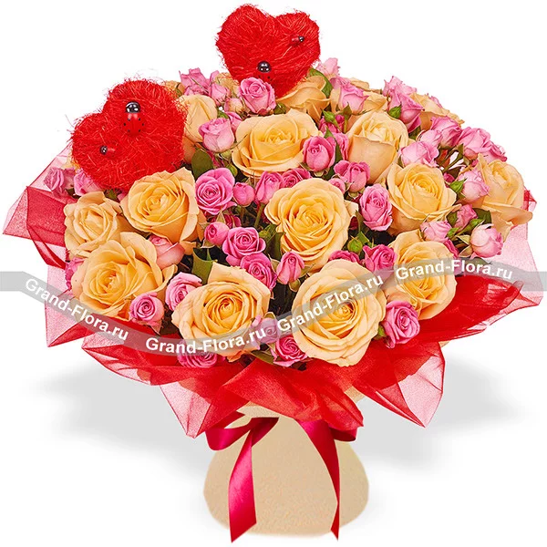 Стандартный: роза кремовая - 11 шт., розовая кустовая роза - 6 шт., декор, упаковка, лента.